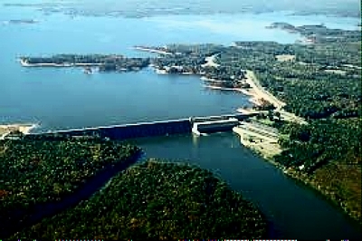 Aerial view of Kerr Dam and its lake that straddles the Virginia/North Carolina border, a popular destination for outdoor recreation since the 1950s
