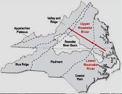 The North Carolina stretch of the Roanoke River and its basin from the Virginia/North Carolina border east to its terminus in the Albemarle Sound. Note the Fall Line near Weldon. The Roanoke follows a  geologic pattern similar to other large rivers in the southeast. Map created by Elaine Roth