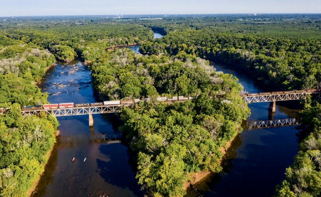 CSX Weldon-to-Wilmington today. Kayakers on the left could be headed to a Roanoke River Partners campsite on the river. Photo credits: Emily Chaplin/Chris Council