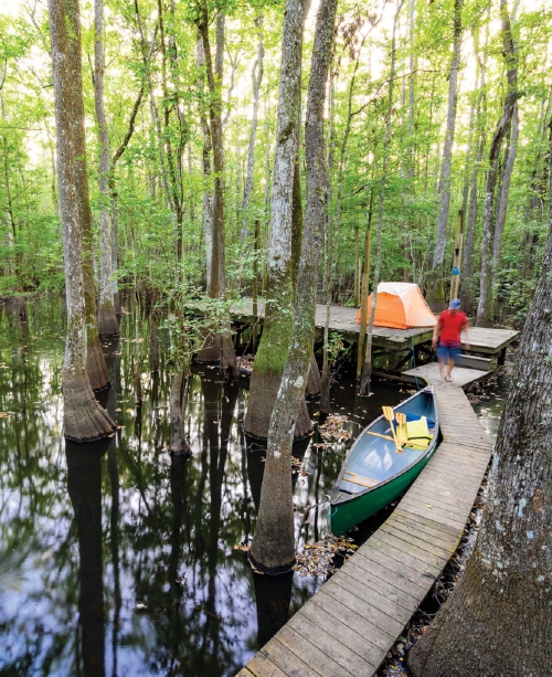 A wilderness camper’s paradise. Tent platform nestled among bald cypress, one of several stopovers in the bottomlands for kayakers. Roanoke River Partners project and photo
