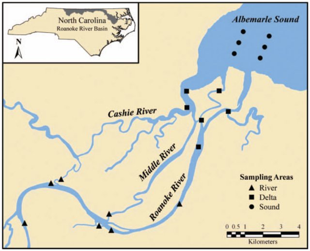Schematic showing the Cashie and Roanoke Rivers flowing through the delta before reaching Albemarle Sound.  roanriverdeltasound-bioone.jpg