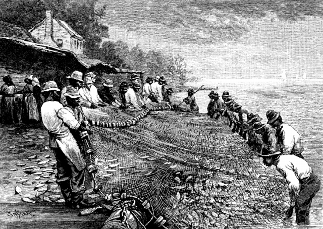 After lean winter months for families, the arrival of herring, shad and striped bass was a time of hard work, high spirits and celebration. A good herring catch, salted, was insurance against hunger during winter. There seemed no limit to the ways fish could be corralled. Even youngsters put buckets to river.