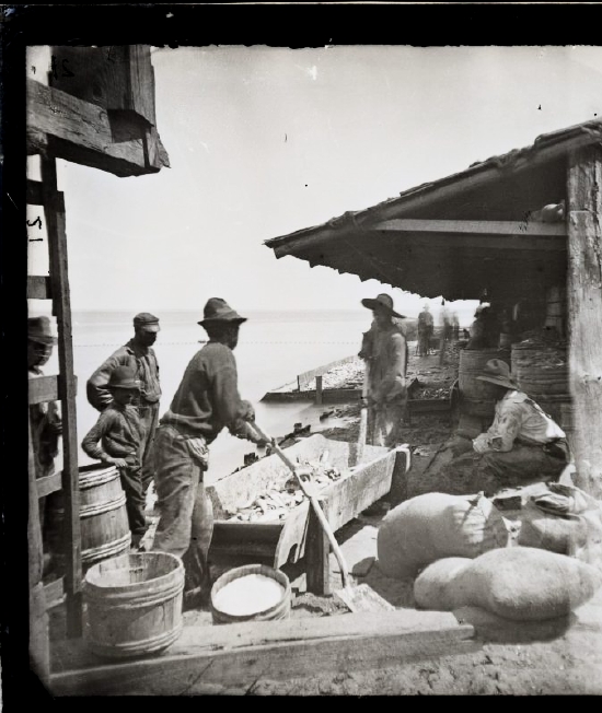 Extracting shad roe 1877 at the Capehart fishery on Albemarle Sound. Smithsonian Institution archives