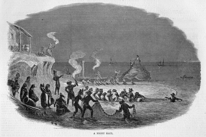 Of all the striking views of this exciting and picturesque business the night-haul is pre-eminent in interest. Here the lively scenes of the day are reenacted amidst the glare of pine torches, which exhibits the wild figures of the fishermen and the death-struggles of the finny captives in the most dramatic light possible.
