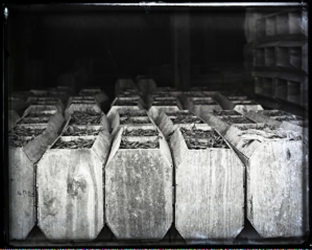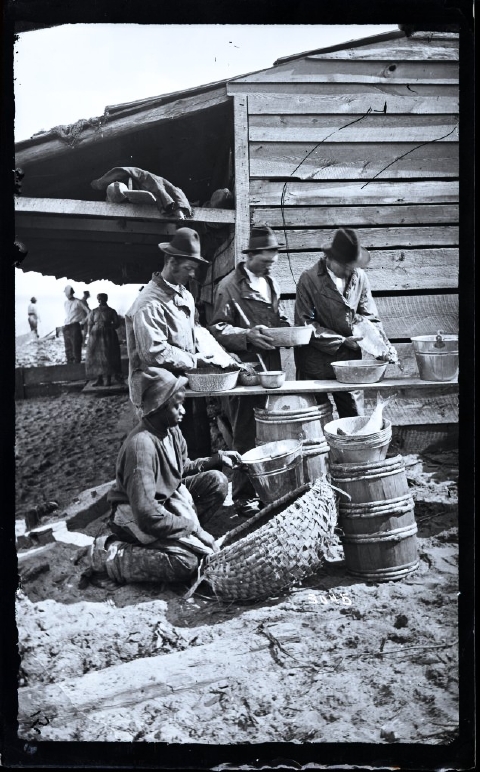 Salting the herring for dinner at the fishery. Much larger troughs are used when salting for shipping. Smithsonian Institution Archives