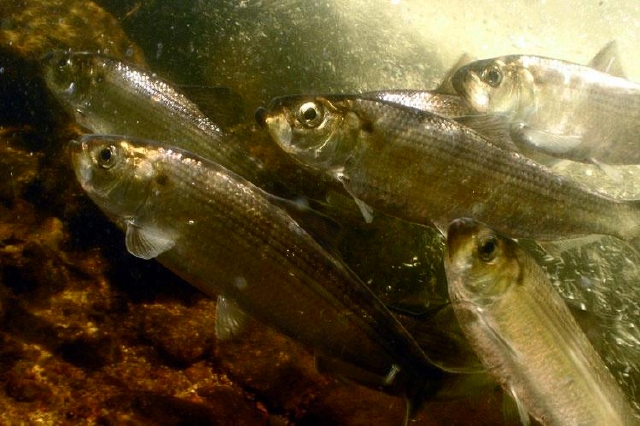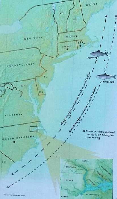 Bluebacks and alewives, collectively called river herring, are anadromous fish. They spend much of the year in the North Atlantic, then migrate south to the brackish water of the Sound to spawn. Their lives outside the Sound are a mystery, except that they are eaten by big fish and sea birds. NC Wildlife Resources Oct 2007