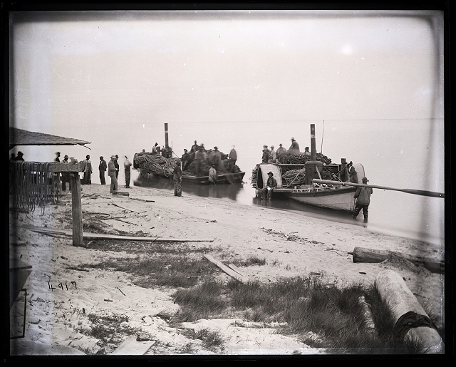 At least thirty men heave thousands of fish onto the beach at Avoca in Bertie County 1877. Smithsonian Institution Archives