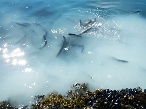 Spawning herring. Milt from the male turns water milky, while females lay eggs on the substrate. Alaska Fish & Game