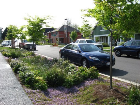 Street-side swale and pervious concrete sidewalk that allow rain water to seep into the soil are ways to control urban run-off. Wikimedia
