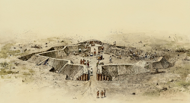 Deteriorating relations with the Secota tribe caused Ralph Lane and his men to erect an earthwork fort in 1585. Archaeologists have located its exact dimensions and replicated it on the Fort Raleigh site in Manteo. National Park Service diagram