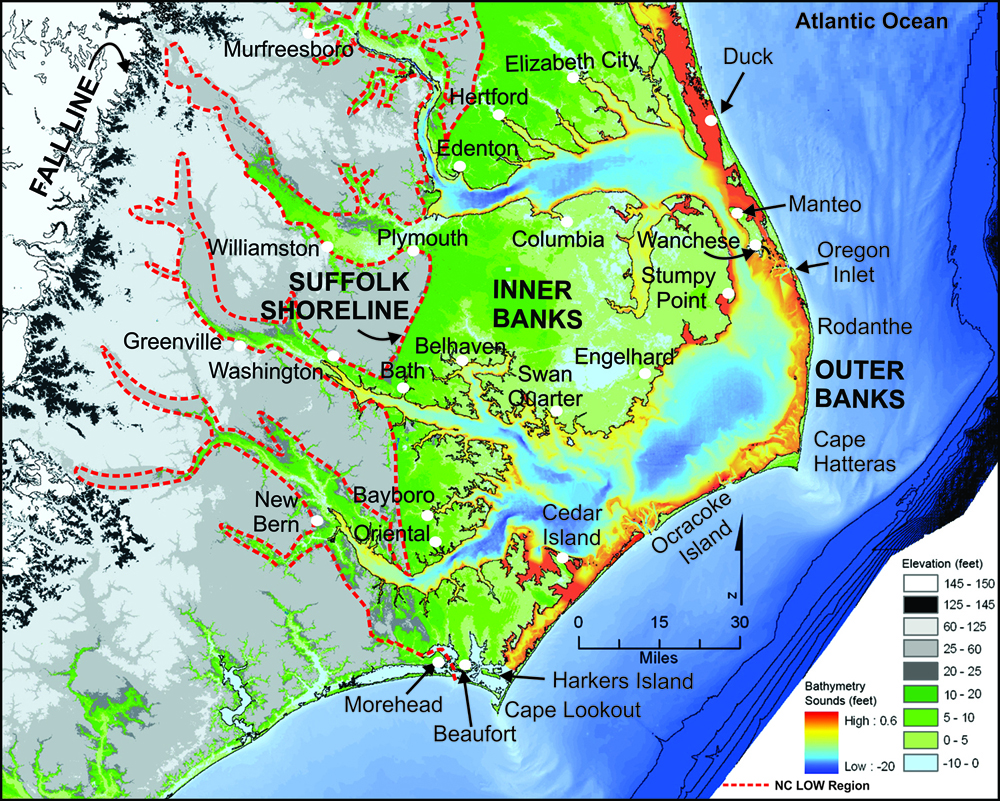 The Albemarle area today showing the coastal plain vulnerable to sea level rise, the old Suffolk Shoreline at 25 to 50 feet above sea level, and the Fall Line (in black) where the rolling hills of the Piedmont begin. NC Land of Water