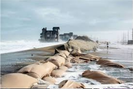 Sand bags scattered on the barrier beach after a storm. Not working too well, judging from the flooding. NC Coastal Federation