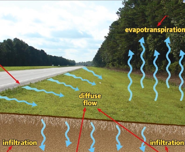 Wide swales on the side of a road diffuse runoff of rainwater and sediment, further helped by woodlands that transpire moisture. On grand scale, this is a technique that would mitigate runoff from miles of impervious roads, driveways and parking lots. NC Dept of Transportation