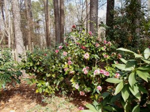 A mix of plants: short camellias, tall camellias in rear, Southern Indian azaleas foreground (not shown), and Florida anise to the right