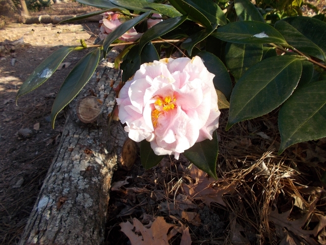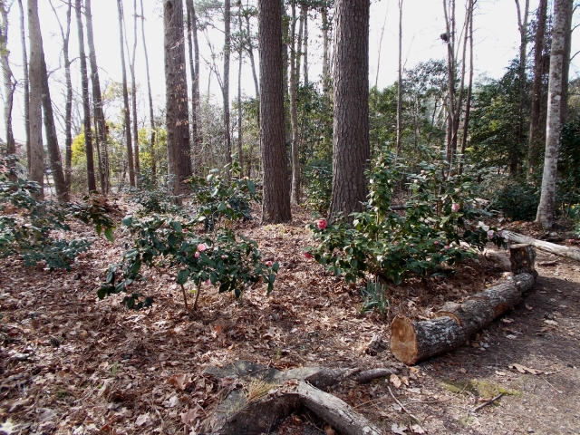 This woodland bed tends to be planted in rows, so we must go hunting to find camellia blooms in the rear. Tuteur is set up for occasional watering