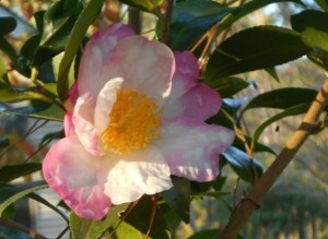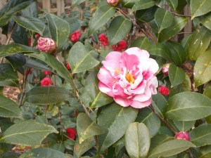 Sasanquas bloom fall to winter, can take more sun and more moisture than Japonicas but can get rangy and need pruning to bring them down to size. Their flowers fall apart and drift to the ground petal by petal creating sensational groundcovers.
