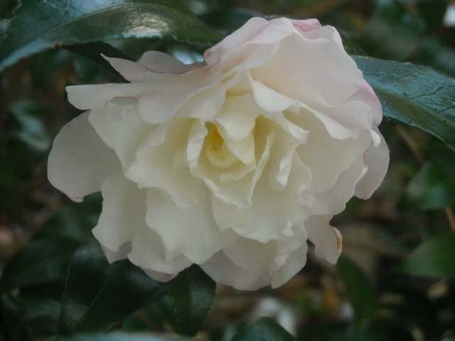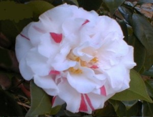Another carefree camellia, C. japonica ‘Tama no Ura’ with a striking picotee edge