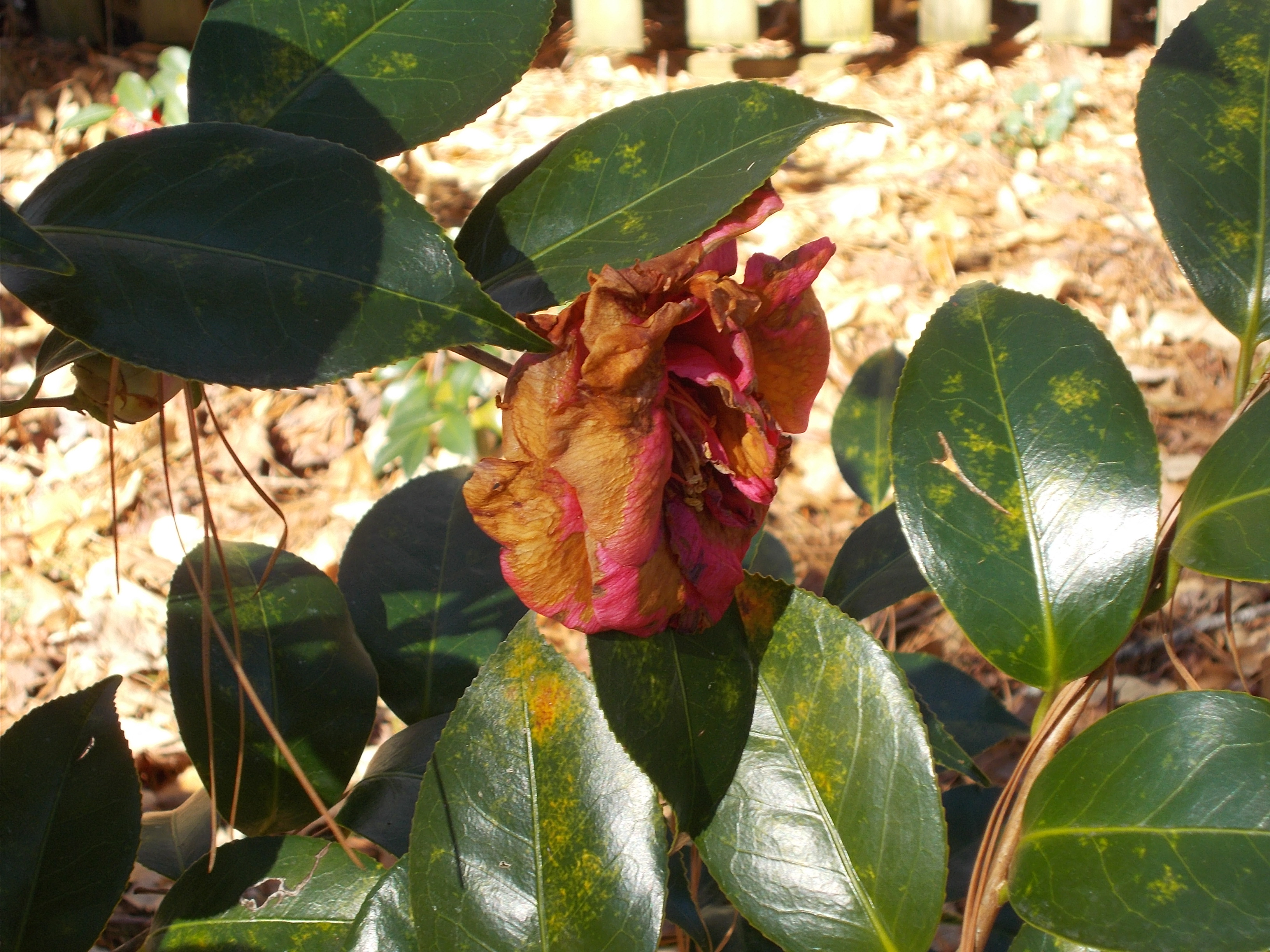 C. japonica shows signs of freeze damage on its top petal