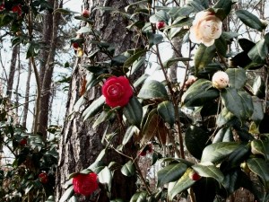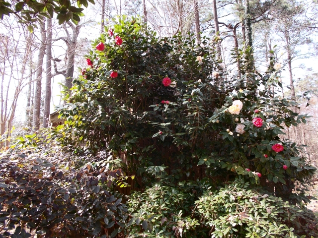 A truce of sorts between camellias and big trees had apparently been negotiated, though we were not privy to the plant talk. We could only watch from above. Their blooms are brightening winter days for us and our neighbors.