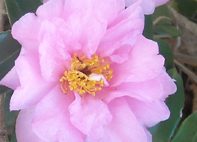 A small rose-form camellia, center still tightly closed. As the blossom opens fully, its simplicity may attract foraging insects