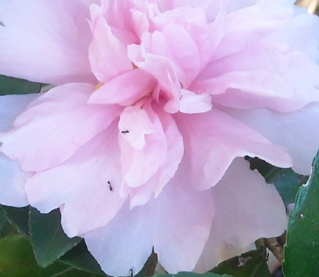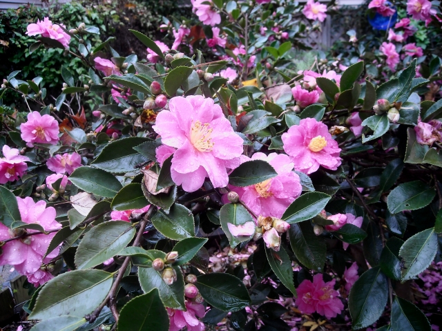 Camellias bloom when the garden is brown and the weather is chilly and the world is napping. Those occasional balmy days that break up cold weather stretches are like dinner bells to torpid bees and ants.