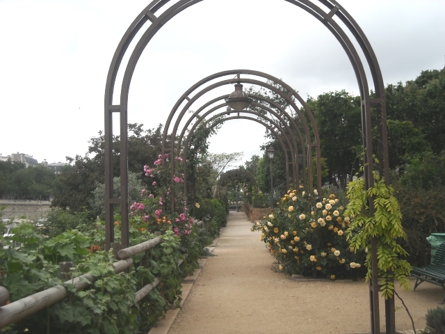Now we were soldiering on in murky weather, crossing the Seine and hurrying along picturesque Canal Saint-Martin toward the Promenade when, surprise, we stumbled into yet another garden, Jardin du Port de L’Arsenal, one of the prettiest spots in Paris. We had to explore.