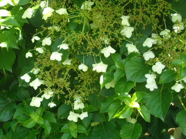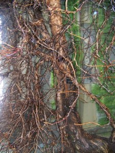 We say judicious, because climbing hydrangea can be a scary plant. Especially in winter when leaves are gone. Old trunks are grizzled with dark hairy roots and exfoliated gray bark. Younger trunks shed great cinnamon strips. New growth of the year, maroon branches tipped with pale pointy buds, look like witches’ fingers beckoning the unwary into a maze of old blossoms and twigs from which there is no return.