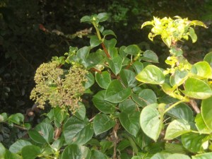 We probably didn’t give our plant enough space. Yes, you can pin this one on us. It rambles over and through a four-foot picket fence, grabbing on to pickets with strong rootlike holdfasts, ranging about ten feet in ten years. Is it holding the fence up or is the fence holding it up?