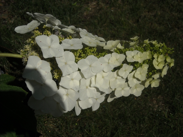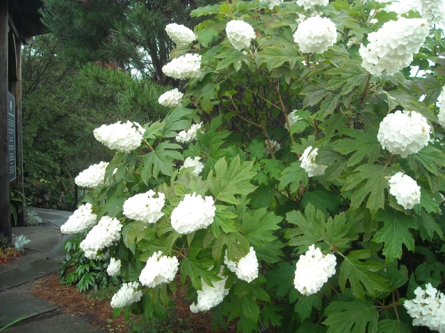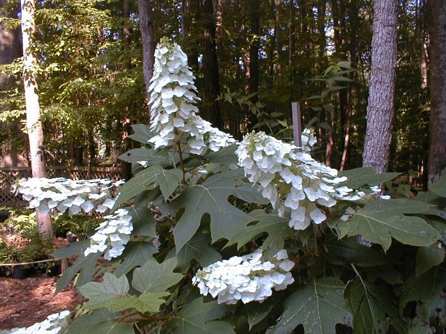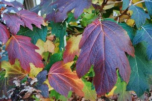 creamy blooms dissolve into a modest blush. Later, as weather turns cool in these gardens, come-hither rainbows of burgundy, burnt orange and purple on bold “oak” leaves can wow a viewer.