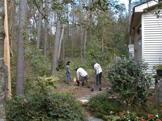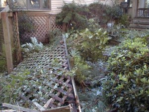 Shrubs dangled high in the air, caught in mounds of uprooted trees. Garden books don’t generally include this kind of rescue operation in their how-to discussions, but the Poirot-Nightingale team was on top of the situation, improvising–and hoping.