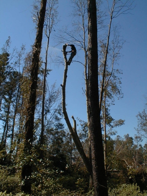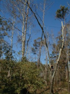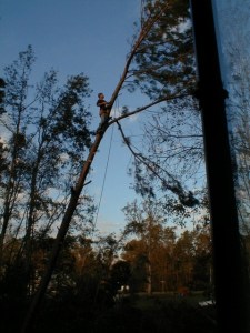 This is tricky work on unstable trees. We dared not breathe as we watched the balancing act. The Texas Tree Man was a pro. He climbed, roped and cut with confidence and skill. He was part of an unofficial cast of lumberjacks who follow major storms. He came recommended by a neighbor we hardly knew. He did a cracker-jack job. We’d hire him again, if we could remember his name. And find him.
