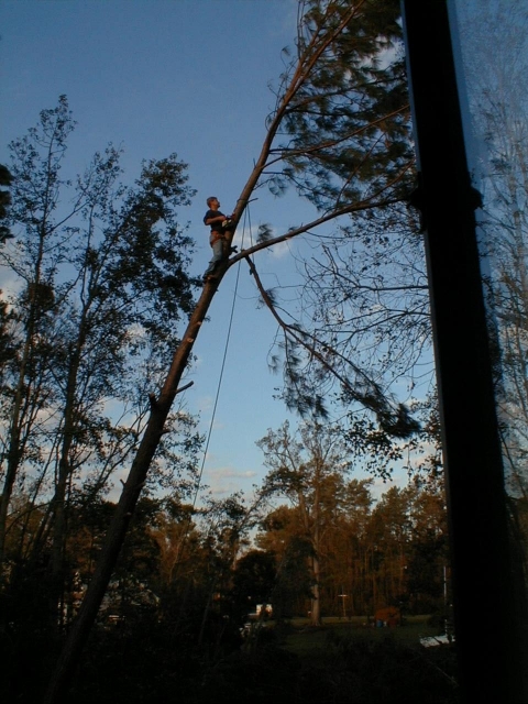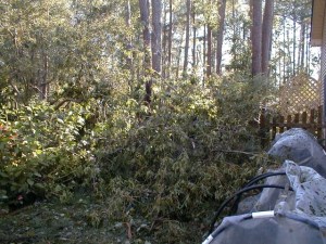 A young crabapple lay crumpled under an eighty-foot pine. Poirot manned thechainsaw to free the crabapple, and Florence assisted with the rope and bungee that would pull the crabapple upright for staking to a nearby red maple.