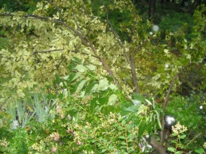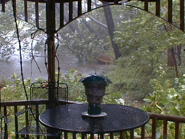 Goldfinches are having a hurricane party in our gazebo. In and out they fly, precisely timing their flights between gusts. Chickadees dive for their feeder, stop abruptly in mid air. Beneath them, cardinals rummage for sunflower jetsam. Hummingbirds zip by for a nip and do a puzzled turnabout.