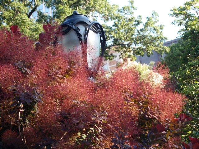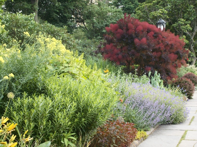 What a backdrop these hedges form for glorious beds of shrubs and perennials, closely planted, nudging one another into a tapestry of color and texture that plays under saucer magnolia trees so twisted and tumbled they must be centuries old, but of course they are not. Young and vibrant smoke trees are bold grace notes tucked into the landscape.