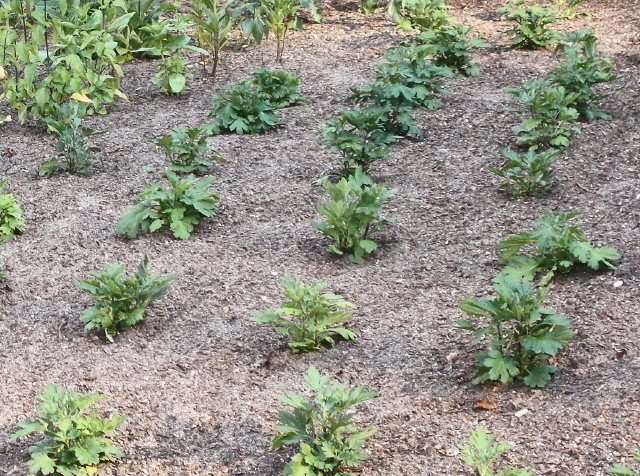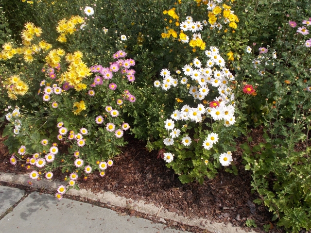 So I took a closer look at my photos from June. The new plants looked pretty bushy for their size. Tough love here, heavy clipping, probably more than once before they were planted, would encourage strong branching to keep mums standing at ease. (There was probably some furtive leaning on neighbors, but we didn’t notice.)
