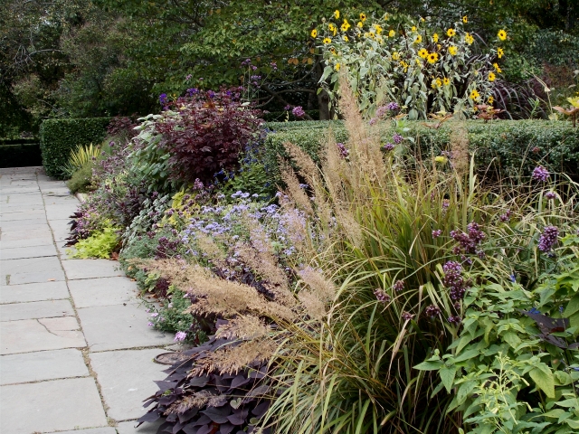 At last, we meandered into the English-style garden to stroll and set a spell, and we were not disappointed. Beds had become even more lavish than in June.