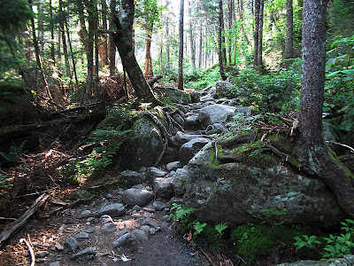 We’d just met them, but we had all become buddies by virtue of the trail we were about to take. We parted with promises to meet at the Mizpah Spring hut. The deep green woods closed in on us. We started a gentle ascent. This was fine hiking.