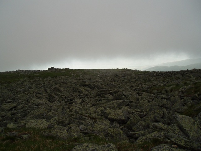 The cairns were beacons in this featureless wilderness. We climbed through the clouds, seeing nothing ahead except cairns hazy in the mist, each cairn a goal we locked on to.